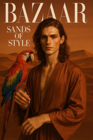 male auburn macaw desert scarlet bronze bird sunset editorial robe flowing masculine makeup chiseled boho warm silk indoor orange soft toned skin coordinated glamour fashion studio styling capsule harmony beauty model harper trend surreal cover chatgptImagine Buddy