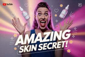Happy beauty expert reacts to skincare bottles and sparkles floating on soft pink purple gradient, secret glow-up moment, ai thumbnail prompts included