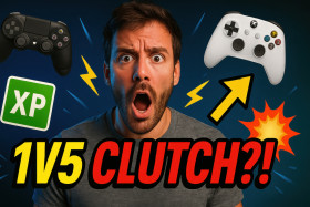 Shocked gamer surrounded by game controllers and xp symbols, dark neon background, intense clutch win concept, text-to-image thumbnail prompts included