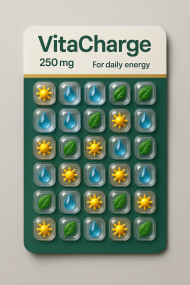 Vitacharge blister pack mockup with sun, droplet, leaf for energy and vitality, modern clean look, perfect for discipline pack, chatgpt image prompt