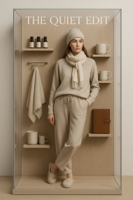 fashion doll luxury hyperrealistic model female packaging box retail cashmere loungewear soft set slippers knit beanie silk scarf journal leather cozy home relaxed modern casual chic warm mockup prompt chatgpt image comfort serene calm eleganceImagine Buddy