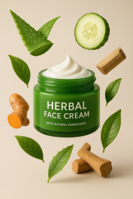 herbal cream face product aloe turmeric cucumber sandalwood green tea floating midair skincare center glossy vibrant clean studio beige natural smooth soft organic ingredient botanical treatment beauty glow lighting cosmetic balanced prompt design marketing chatgpt posterImagine Buddy