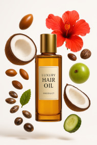 luxury oil hair product argan coconut castor hibiscus amla floating midair glossy vibrant clean white studio smooth shine center ingredient botanical treatment serum natural premium beauty soft therapy glowing plant balanced prompt chatgpt design marketing poster 3dImagine Buddy