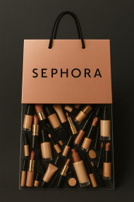 Rose gold bag with sephora logo holding cosmetics inside clear bottom on charcoal background. branded bag chatgpt prompt carry bag product mockup packaging design branding