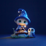 wizard 3d cartoon owl magic animal pixar style character cute whimsical mushroom gradient eyes robe wand green stars soft lighting illustration friendly round simple clean texture fantasy heartwarming scene adorable detail digital glowing charm midjourney promptImagine Buddy