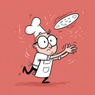 Playful cartoon chef tossing pizza dough, wearing a hat and apron. clean lines and flat shading for a fun, quirky character illustration. midjourney prompt cartoon character, playful design