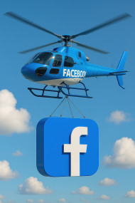 Cgi-style helicopter in facebook colors lifts large 3d logo in sunny sky with fluffy clouds, creative aerial ad design with chatgpt prompt, branding and vehicle theme