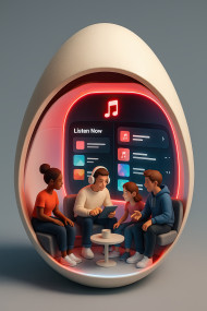 egg music 3d diorama art prompt apple lounge playlist ui glow friends ambient red blue white digital curved sleek futuristic interior vibe album lighting immersive sound scene composition vertical poster mobile tech stylish chatgpt accents moodImagine Buddy