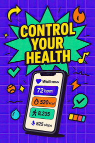 Bold flat grid background with smartphone wellness dashboard, electric green burst reads “control your health”, comic visuals, tech lifestyle prompt via chatgpt