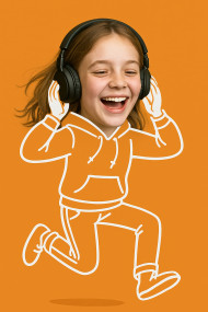 Teen girl photo head on stick figure in hoodie jumping with headphones, bright orange backdrop. stick style character, image generation, chatgpt prompt, artistic ai prompt
