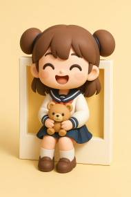 Kawaii 3d schoolgirl in sailor uniform holding teddy bear sits in soft yellow polaroid frame, joyful and sweet, stylized ai portrait, polaroid frame art, chatgpt image prompt