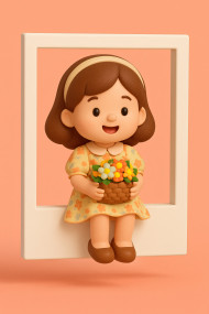 Kawaii 3d woman in floral dress holding flower basket sits in coral polaroid frame, relaxed and cheerful, stylized ai portrait, polaroid frame art, concept art prompt