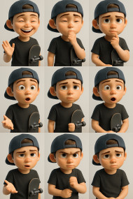 Playful boy in black t-shirt and cap with skateboard shows emotions in 3d portraits with clear expressions, pixar style prompt, emotion grid art, digital storytelling art