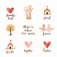 Watercolor homes, hearts, trees, and holding hands with loving quotes like family first, dreamy colors show warmth and unity for family-themed sticker sets