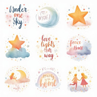 Stars, moons, clouds with glowing watercolor gradients and sweet phrases like under one sky, magical cosmic designs for loving family-themed sticker sets