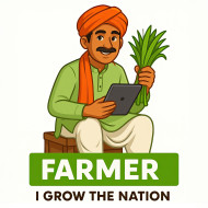 farmer indian man hindu cartoon character sitting crops tablet crate dhoti kurta scarf rural agriculture turban orange green red white traditional proud warm outdoors village harvest produce fresh hand wheat vegetables ethnic technology brown nature digitalImagine Buddy