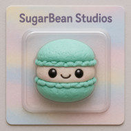 Chibi macaron toy with sweet face in soft pastel clay style, packed in plastic on square card, handmade mini collectible for dessert lovers and gift fans