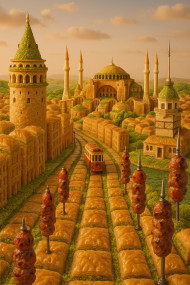 istanbul baklava kebabs miniature city skyline buildings monuments streets edible creative turkish food savory sweet sculpture crafted gourmet architecture urban iconic cultural landmark detail artistic cuisine traditional imaginative historic grilled heritage flavor touristImagine Buddy