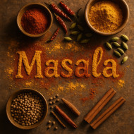 Word masala crafted from indian spices on stone in warm kitchen scene, turmeric and chili glow with golden light, rich texture in an artisanal vibe