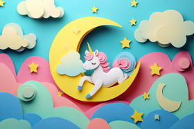 Sleepy moon cuddling tiny unicorn in paper-cut starry sky, glowing night scene with soft shapes and magical charm full of dreamland warmth