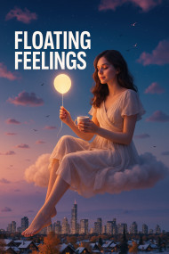 Dreamy giant woman in chiffon dress floats on a cloud above city skyline, holding glowing balloon at dusk, soft pastel sky with floating feelings text
