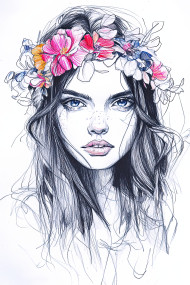 Girl with floral headband drawn in felt pen, delicate sketch with soft features, romantic style, hand-drawn fashion concept with modern touch