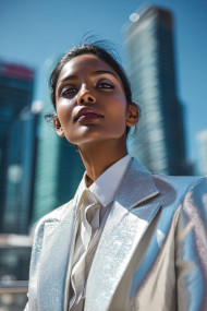 rooftop fashion editorial stylish metallic silver white tailored suit confident bold midday glass buildings skyline shadows defined urban blue pose model power sunlight clarity standing modern skyscraper natural highlights crisp assertive structure sleek clean highrise daylightImagine Buddy