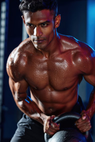 exercise gym indian man athlete powerful workout swing kettlebell training sweat gear ripped strength focus muscle motion definition intensity dramatic lighting shadow hard sharp active performance athleticism lowangle zoom stamina chatgpt prompt fitnessprompt power dynamic masculineImagine Buddy