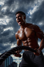 workout rooftop man indian ropes slam battle strength intense roar athletic power muscle gear dramatic lighting action skyline urban definition grit contrast split flex lowangle dynamic stamina sweat outdoors training chatgpt prompt fitnessphoto physique male cityImagine Buddy