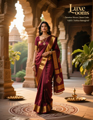 woman saree maroon gold traditional indian south temple ancient courtyard sunset elegant cultural heritage jewelry bindi beauty adult fashion ethnic female goddess graceful style spiritual tourist landmark draped outdoor dusk model portrait clothing brands prompts chatgptImagine Buddy