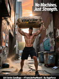 Strong man raising heavy sandbag overhead in gritty urban alley gym with dust, graffiti walls and raw power fitness products chat gpt prompts