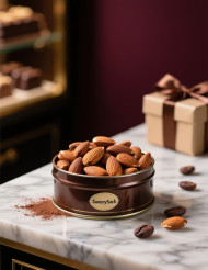 Tin box of almonds on marble counter with cocoa beans and ribboned gift box blurred behind, premium indulgent snack, food packaging chat gpt prompts