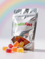 pouch upright gummies colorful spilling glossy sugar granules plastic rainbow tones cheerful health food packaging candy sweet fruity confectionery snack vibrant playful multicolor nobody kids jelly bright fun nutrition texture gelatin tasty dessert natural chatgpt promptsImagine Buddy