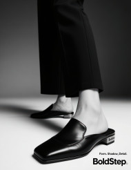 Fashion model standing in a studio wearing black matte slip on mules with square toe, crisp overhead light casting sharp shadows, footware brand chat gpt prompts