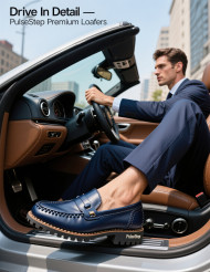 Male model driving a sports car in navy loafers with rubber sole nubs, polished leather detail on pedal, footware brand chat gpt prompts