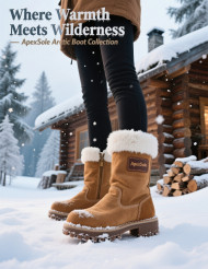 woman standing snowy log cabin winter boots suede fur lined cold snowflakes pine trees cozy outdoors nature warm rustic seasonal one female footwear brand chat gpt prompts frost forest holiday alpine mountain wood cottage frost weather white ruralImagine Buddy