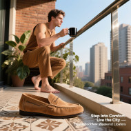 Man on balcony sipping coffee in suede loafers, warm sunlight, plants and city skyline reflect relaxed urban lifestyle, footware brand chat gpt prompts