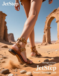 woman walking barefoot gladiator sandals tan gold rivets desert ruins ancient sun golden shadows historic regal footwear brand outdoors travel elegant heritage archaeology vintage summer lifestyle stylish female fashion journey architecture tourism culture luxury timeless promptsImagine Buddy
