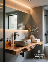 contemporary bathroom stone sink wooden vanity matte black faucet lighting warm elegant spa mood decor products stylish modern design interior cozy home arrangement architecture relaxation natural comfort atmosphere harmony lifestyle aesthetic sophisticated furniture accessories clean minimalImagine Buddy