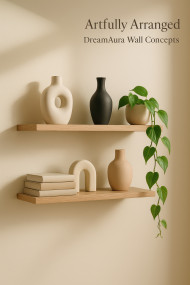 Modern oak wall shelf with ceramics, books, vases, trailing plant, soft skylight shadows, calm minimalist style, home decor products chat gpt prompts