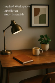 retro home office walnut desk lamp leather notepad mug plant framed wall art morning light style decor products prompts vintage workspace study warm nostalgic rustic organized stylish professional modern creative aesthetic cozy furniture elegant wood minimalistImagine Buddy