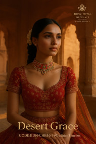 Woman in rajasthani lehenga wearing red green kundan choker in desert palace glow, regal and vintage, jewelry product chat gpt prompts luxury bridal look