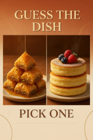 Baklava pyramid with honey and pistachios beside fluffy soufflé pancakes with berries in warm dessert poll guess the dish prompt for chatgpt image