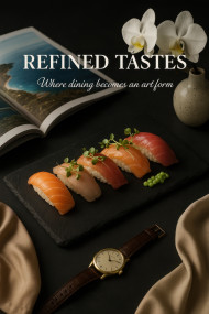 sushi platter microgreens wasabi pearls slate travel magazine orchids silk scarf vintage watch seafood japanese cuisine gourmet raw fish rolls sashimi fresh flatlay elegant dining chopsticks soy minimal styled exotic oriental culinary photography generate luxury promptImagine Buddy