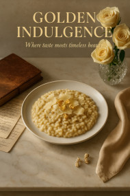 truffle risotto parmesan gold leaf marble journal roses silk napkin pearl earrings luxury flatlay warm natural light food gourmet cuisine dinner plate elegant italian creamy dining indulgence restaurant culinary recipe styling photography decor generate promptImagine Buddy