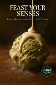 Pistachio gelato scoop drizzled with warm white chocolate, crunchy pistachio bits and melting edges, chatgpt image prompt luxury macro food poster design