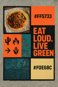 Overhead vegan taco with bold neon text, cactus and chili icons in gritty collage blocks, urban retro futurist mood, transform food branding with neo brutalist chatgpt prompt