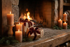 candle gift box christmas fireplace cozy warm glow rustic lodge realistic holiday decor portrait shot velvet texture amber light earthy tones festive ambiance winter interior seasonal background still life christmas soft shadows warm atmosphere prompt google gemini nano bananaImagine Buddy