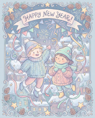 festive characters ribbons new year pastel palette joyful dense scene border composition illustration polished crisp shapes textured strokes visually balanced celebratory mood smooth gradients vibrant colors playful design prompt google gemini nano bananaImagine Buddy