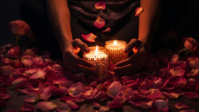 A hand holding a two lit candles while laying on top of petals, diwali festival stock image, diwali festival ai prompt